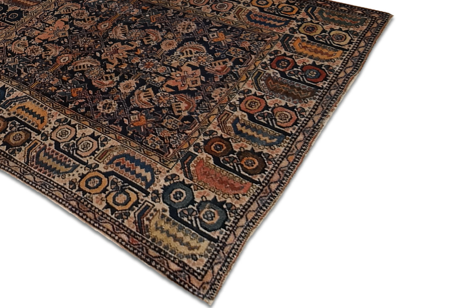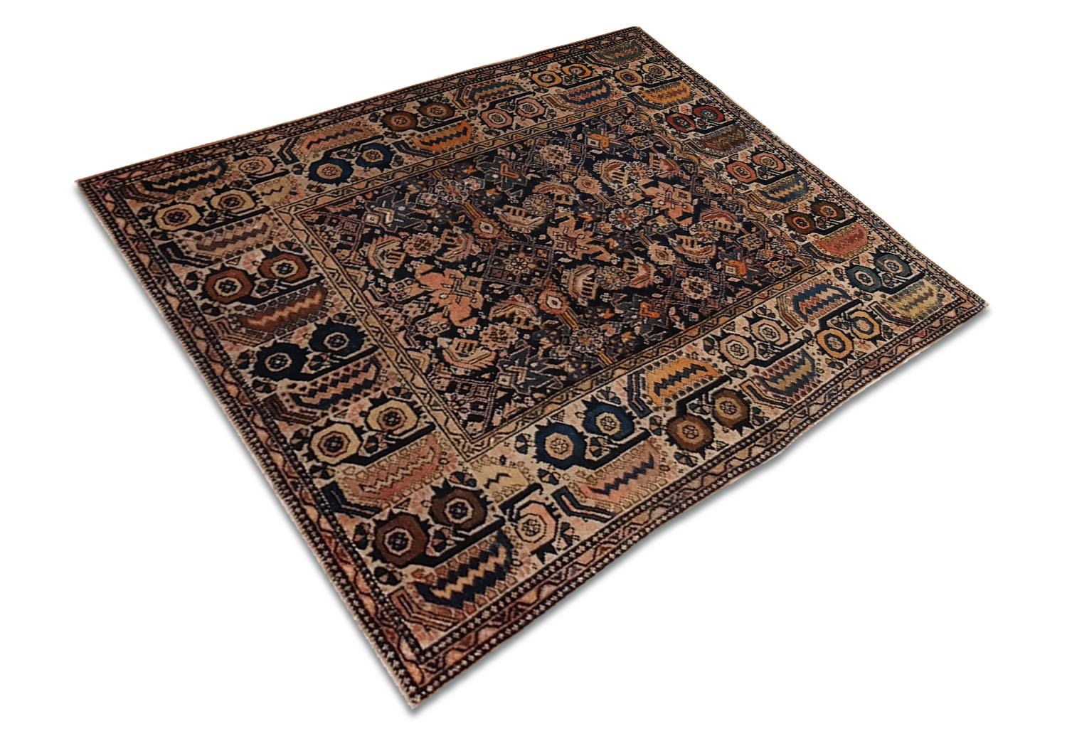 La bordura è uno degli elementi più distintivi: composta da una sequenza di pannelli rettangolari ripetuti, decorati con rosette, zig-zag e motivi a gancio, incornicia il campo con grande forza decorativa. I colori, caldi e terrosi, spaziano dall’ocra al ruggine, dal marrone al blu scuro, con accenti avorio, tutti ottenuti da tinture naturali ormai splendidamente maturate.