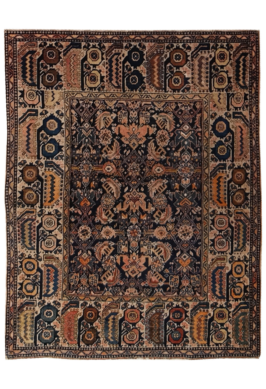 Il campo centrale, impostato su un fondo scuro blu-nero, è densamente decorato da motivi geometrici e floreali stilizzati, disposti in modo simmetrico lungo l’asse verticale. Rosette, losanghe e figure angolari si alternano creando un ritmo visivo deciso e dinamico, tipico dei tappeti caucasici. L’assenza di un medaglione centrale classico rafforza il carattere primitivo e grafico dell’insieme.