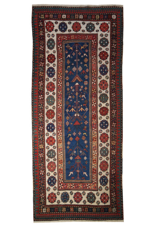 Questo tappeto caucasico antico, proveniente dall’area del Caucaso, è un notevole esempio della tradizione tessile di fine XIX secolo, caratterizzata da un forte valore simbolico e da un linguaggio decorativo arcaico e potente. Il formato allungato suggerisce una destinazione originaria per corridoi o spazi rituali, mentre la composizione rivela una struttura attentamente studiata.